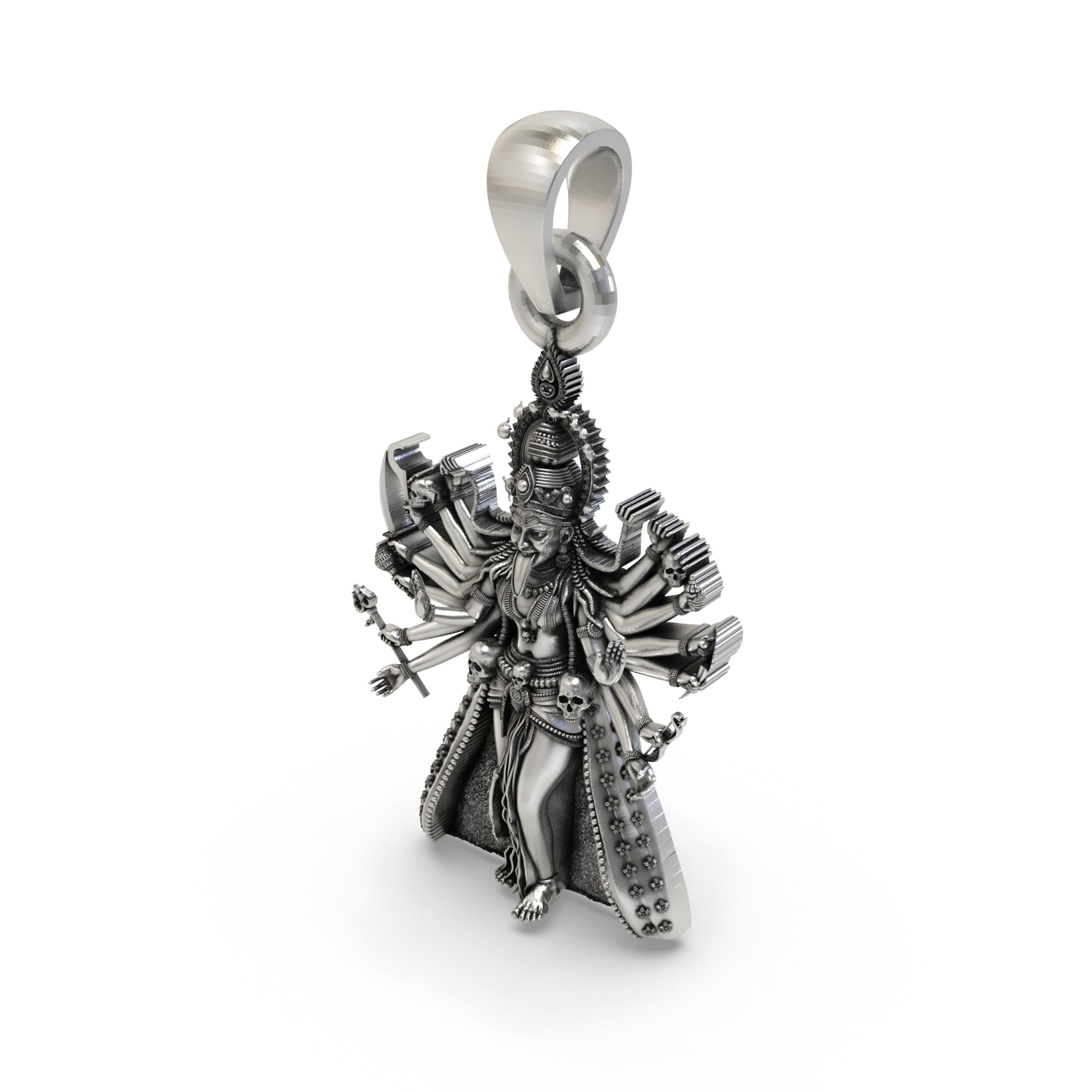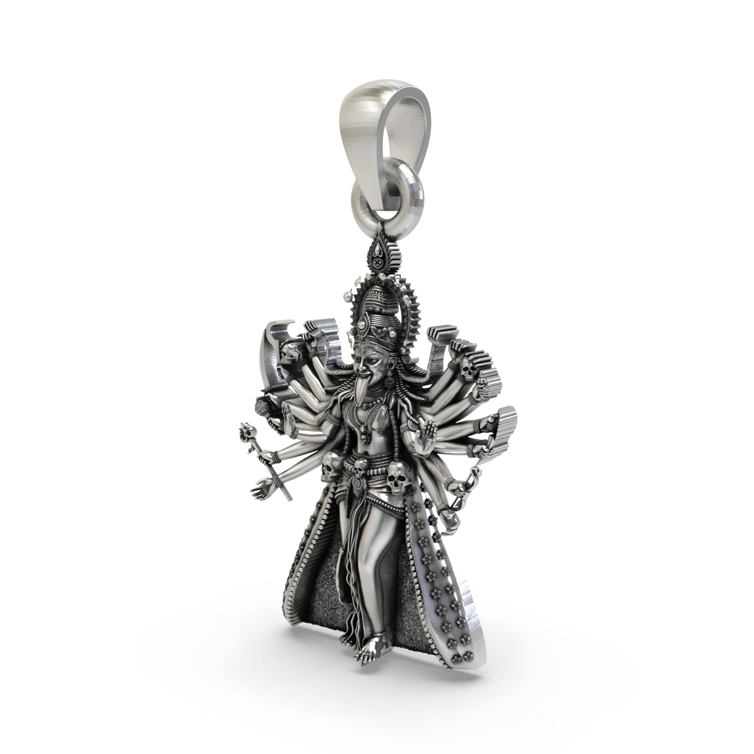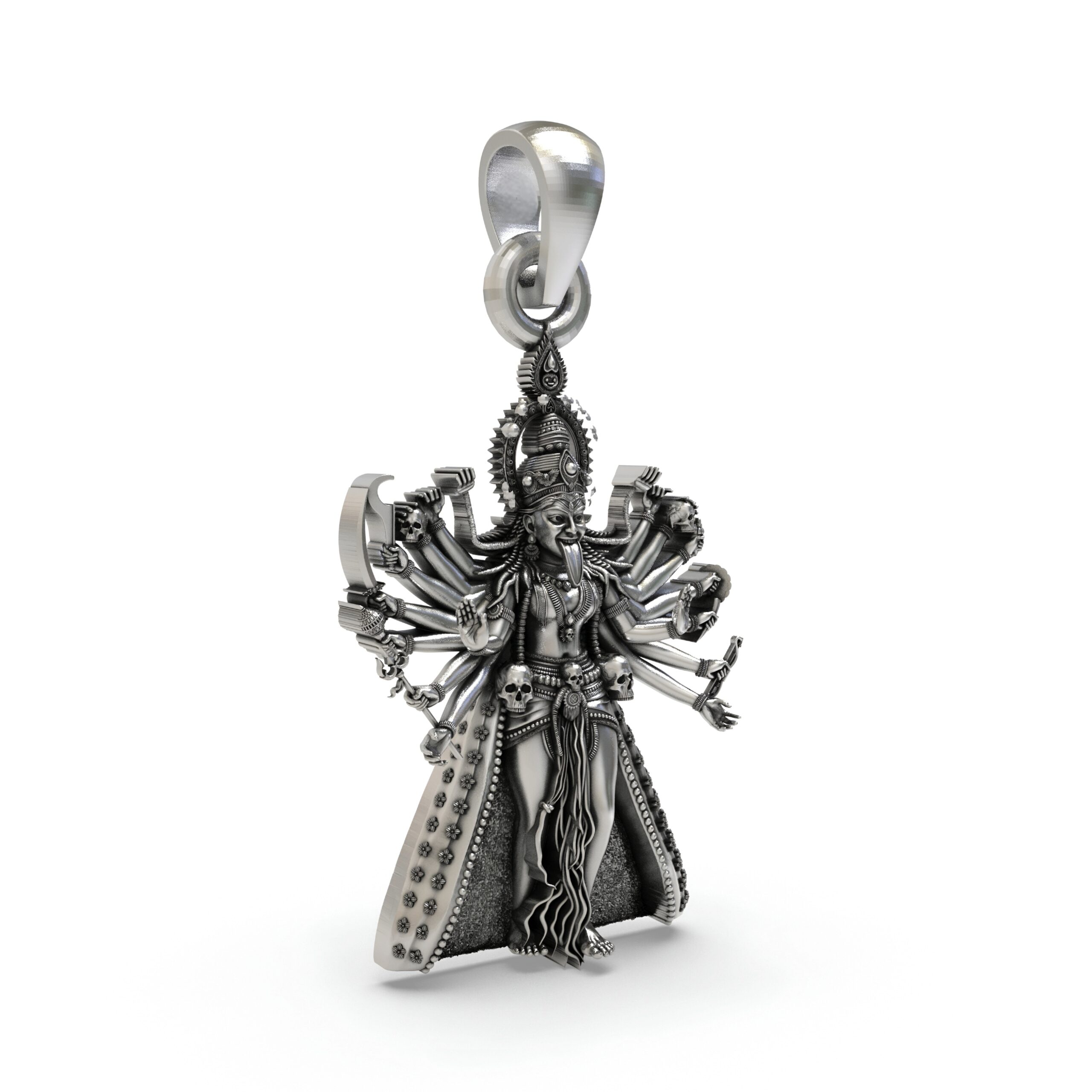 Unleash fearless protection with this intricately sculpted Kali Maa pendant—depicting Mahakali with multiple arms, Trishul, and the iconic skull garland. The antique-oxidized finish highlights every temple-style detail for a bold, devotional look in a compact size.