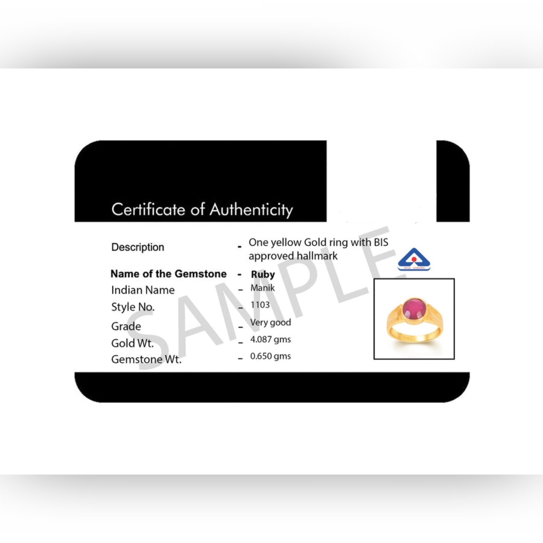 Size of this ring is easily adjustable by hand. Select your size for men (15 to 30 ) and for women (6 to 14). Natural Ruby ring is artistically made according to the astrological needs. Gemstone is left open from the back side for rays to pass through and reach finger properly. High quality making in our own state-of-the-art manufacturing unit gives ring a beautiful look. Gemstone certified by a govt recognized laboratory.